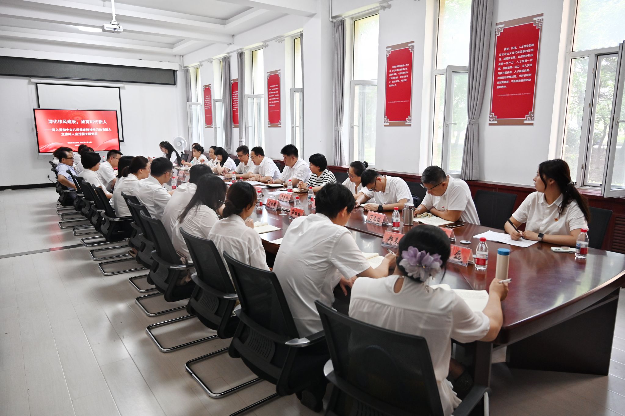 7月2日下午,马克思主义学院教工第一党支部以“深化作风建设,涵育时代新人——深入贯彻中央八项规定精神学习教育融入立德树人全过程”为主题开展党日活动,党委书记贾玉明作为联系党支部校领导参加活动并进行点评。党委组织部部长李录,马克思主义学院党总支委员、其他教师党支部代表列席。本次主题党日活动由教工第一党支部书记邴程程主持。